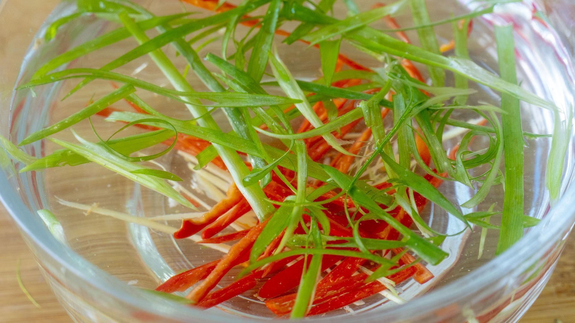 4、全部切好後再把生薑、小米辣、蔥花放入水中泡着;