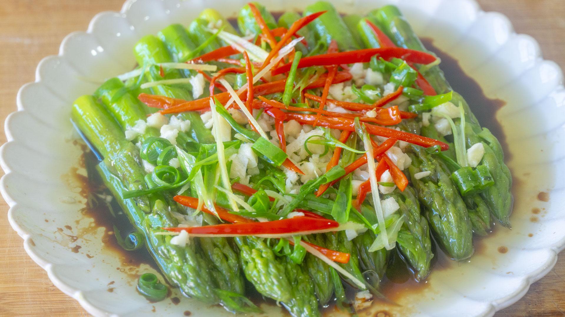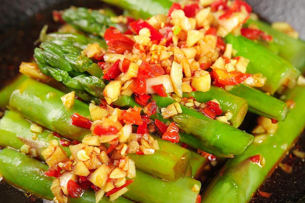 食材:蘆筍300克、蔥、姜、蒜、小米辣、蒸魚豉油