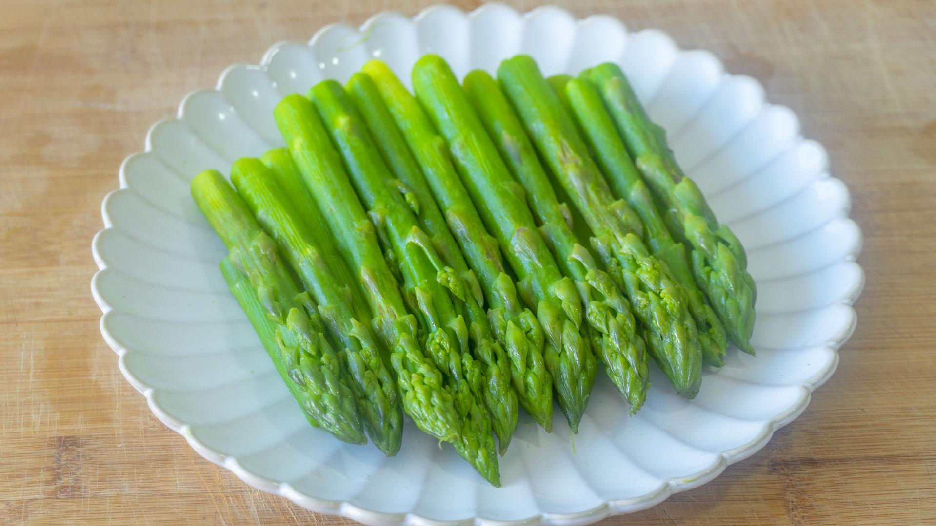 5、起鍋燒水,水開加一勺鹽和一勺油,然後下蘆筍焯水,煮2分鐘後就熟了,撈出來控幹水分裝盤,然後淋上一大勺蒸魚豉油。