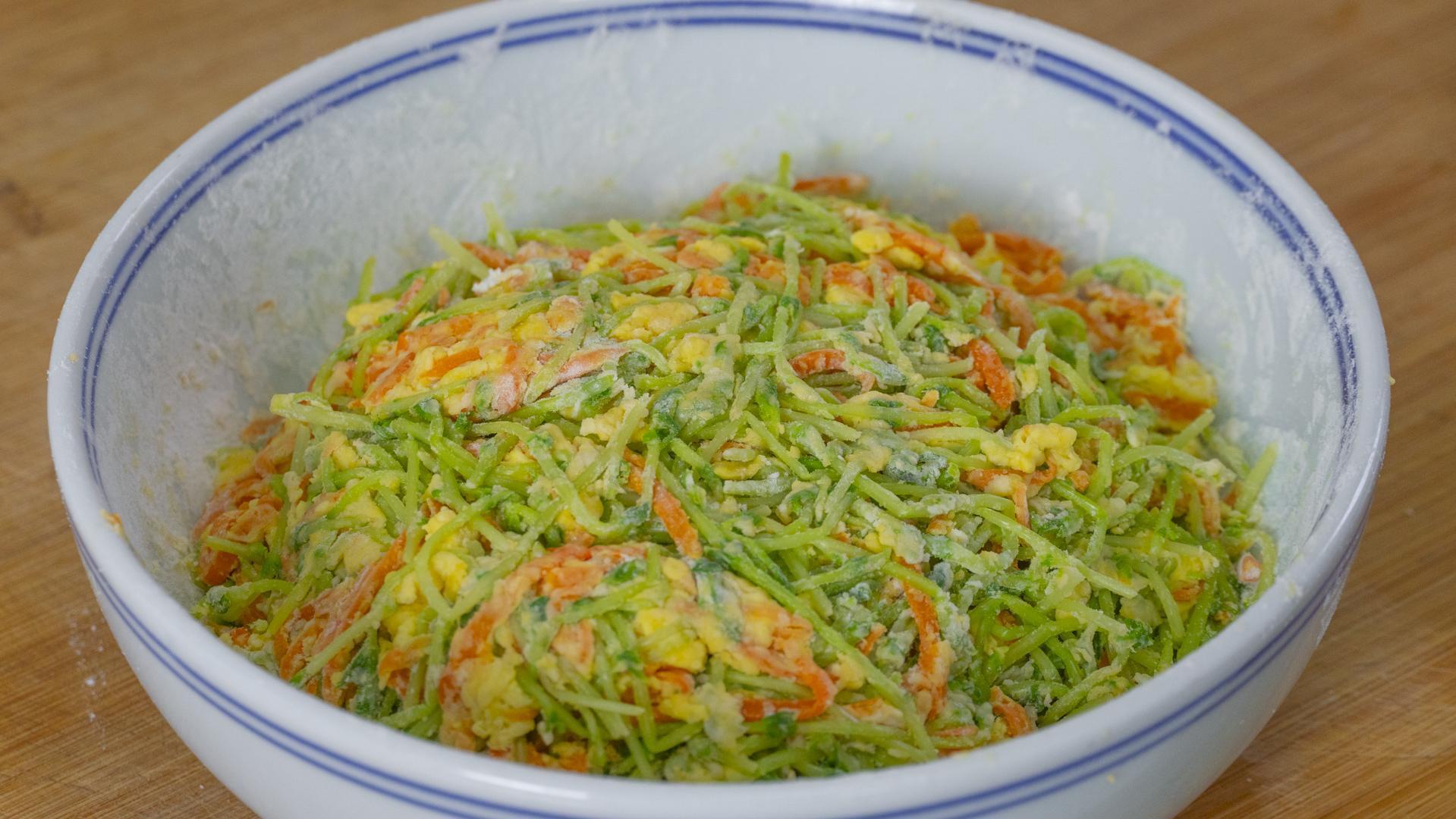5、準備一個大碗,把胡蘿蔔、雞蛋碎,豌豆芽、蔥花都倒進來。接着加一勺玉米澱粉,再加一大勺麪粉,邊加邊攪拌,攪勻後下手去揉麪,能捏成團,不散開就夠了,先揉成一個麪糰兒。