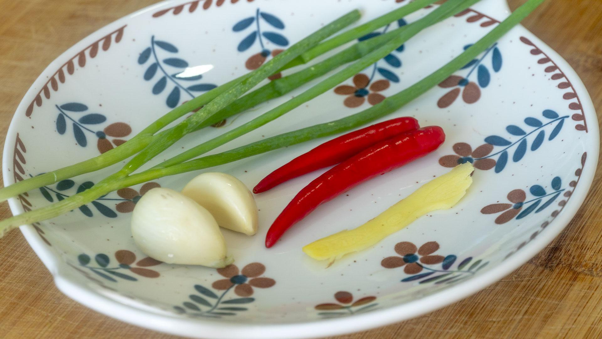 3、接着準備蔥薑蒜和小米辣,大蒜2瓣拍碎切末 ,小蔥2根捲起來後切絲,生薑一片也切成細絲,小米辣2個對半切開後也切成細絲。