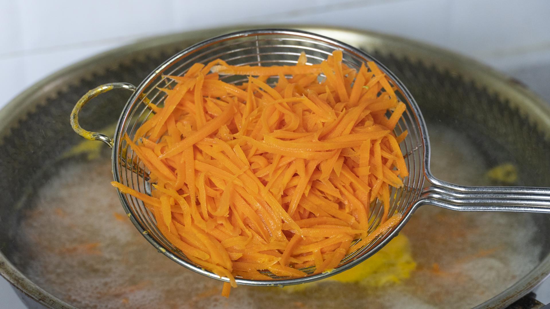 3、胡蘿蔔1根,洗淨後削皮,然後擦成細絲。起鍋燒水,水開到倒入胡蘿蔔焯水,大火煮一分鐘就可以了,撈出來後瀝乾水分放涼。