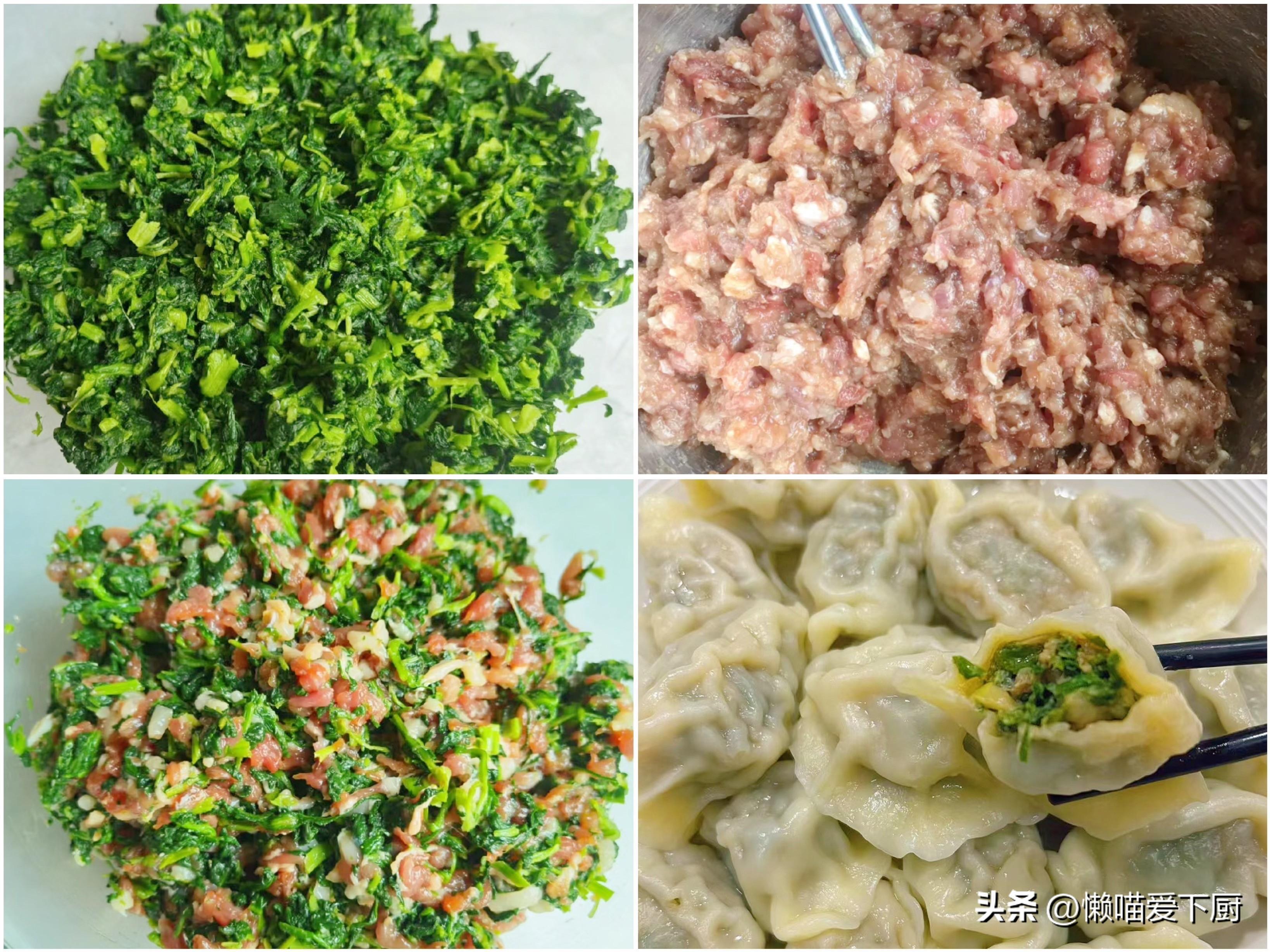 3、將薺菜倒入肉餡中,翻拌均勻,薺菜和肉的比例在1:2左右;