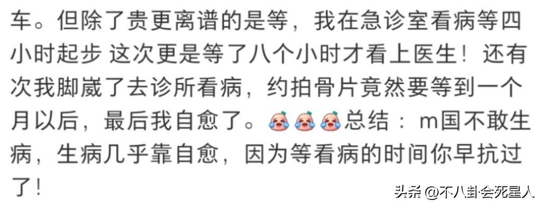 但就算是去診所看病也不容易,劉雨欣表示去看病需要排隊很長時間,看急診都要排隊4小時到8小時左右,而她有一次因爲腿受傷了去約拍片,竟然排隊要排到一個月後,而一個月後她的腿早就自愈了。