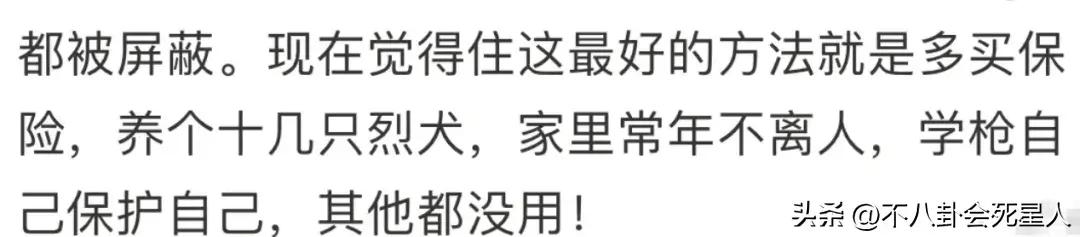 最後劉雨欣總結,只能多買保險,在家裏養十幾只獵犬,家裏常年有人,自己學會保護自己。