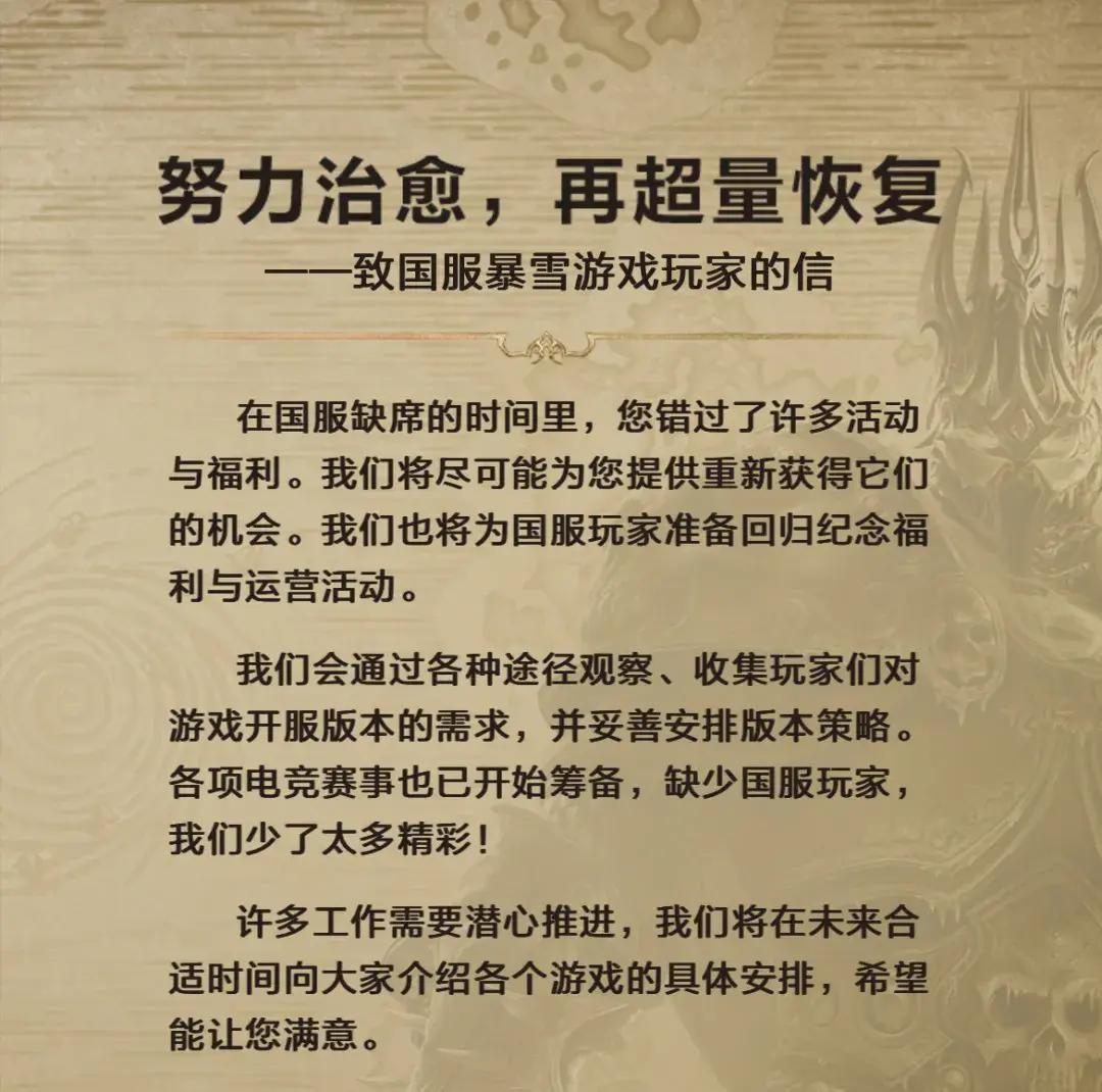 暴雪目前給出的解決思路,是“努力治癒,再超量恢復”。即視情況安排版本追趕策略,同時給予玩家一定的迴歸運營福利。