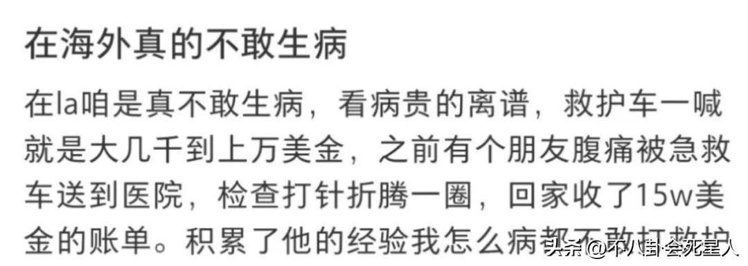 劉雨欣主要吐槽在國外看病的困難,叫救護車動輒要幾千到上萬美金,她的一位朋友就曾經因爲叫救護車收到15萬美金的賬單,這個數目連明星看了都搖頭,所以劉雨欣也表示,自己無論如何都不敢在國外叫救護車。