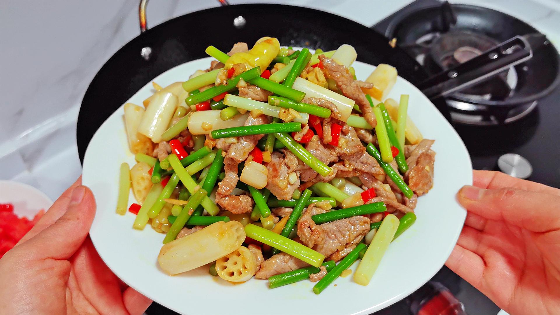 2、藕帶和焯過水的蒜薹一起倒鍋裏面來,調味就加了一點點的鹽、一勺生抽、一點蠔油,大火翻炒幾下,入味就可以了,