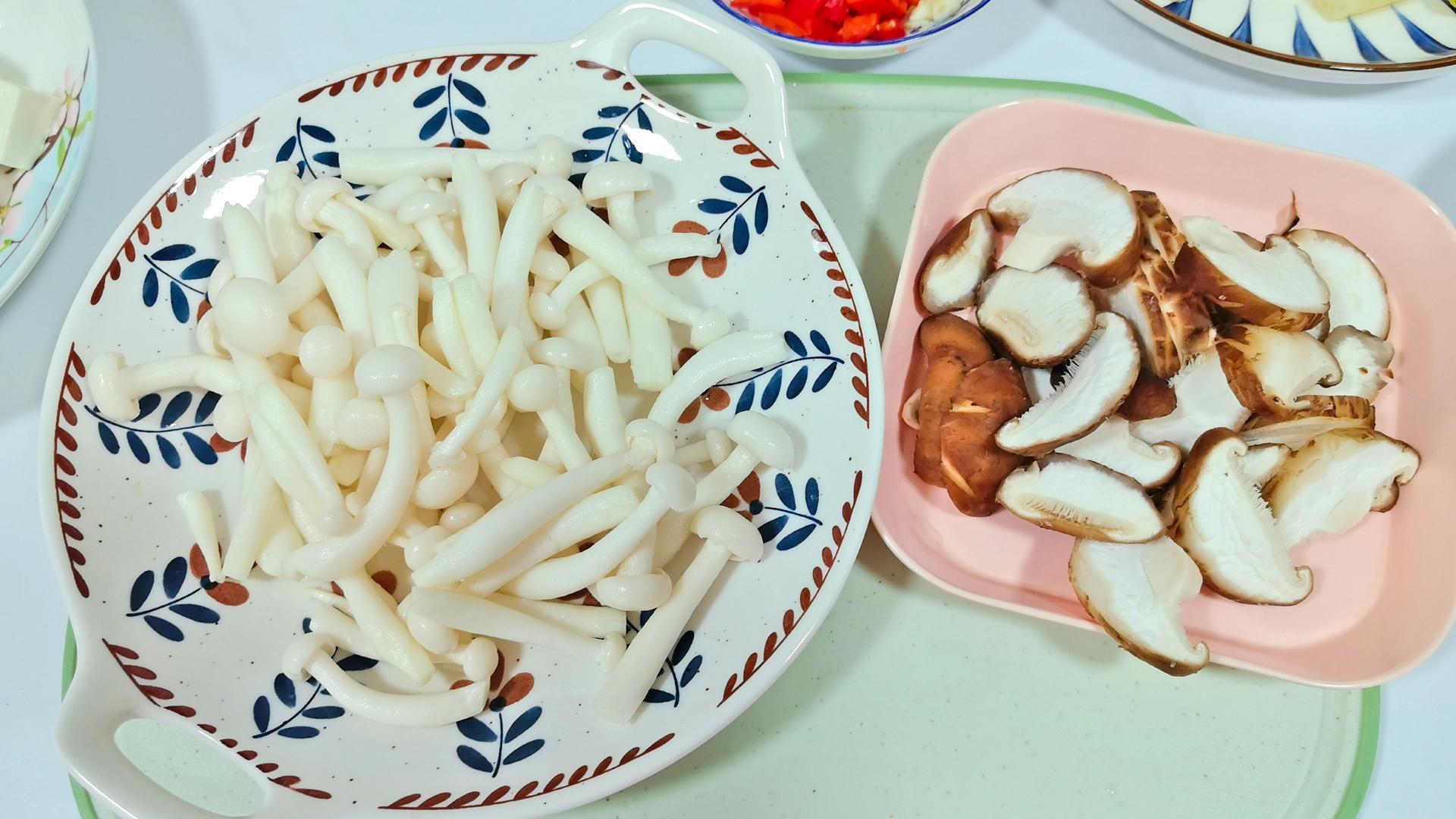 8、還搭配了一點白玉菇和香菇,香菇的話就給它切成片;