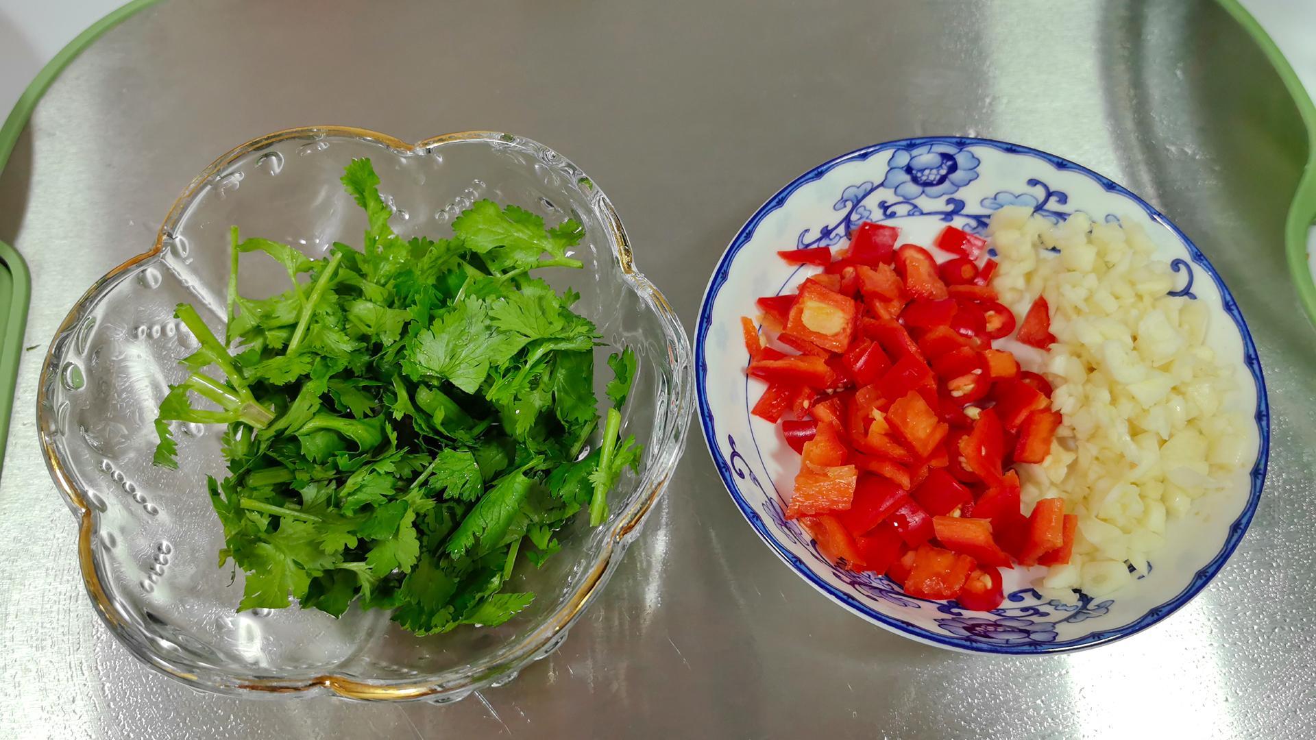 4、大蒜切沫、小米椒切圈、半個紅椒切丁、再來點香菜;