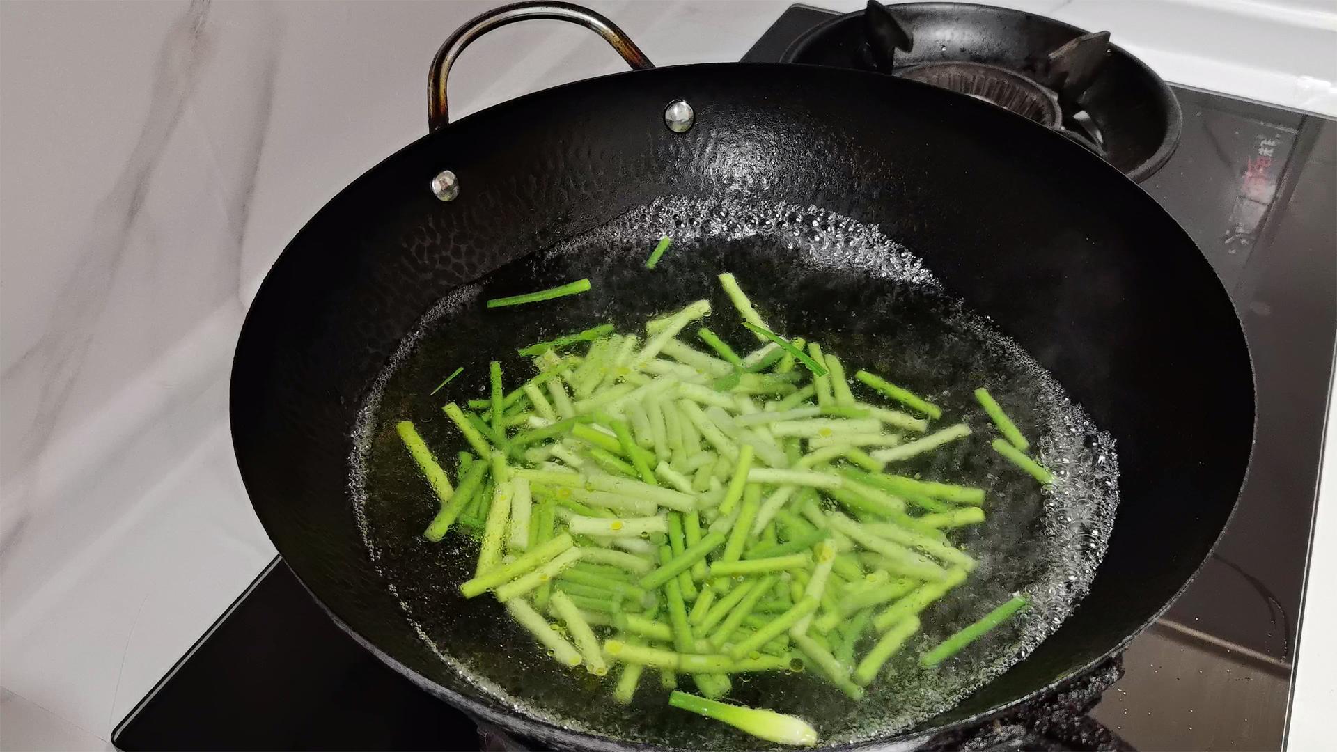 3、蒜薹洗淨後掐頭去尾,切成這種小段,需要提前焯一下水,水開加半勺鹽、一小勺油,將切好的蒜薹倒進來,時間就是1分鐘左右,撈出來再過一下涼水,這樣可以保持蒜薹的口感;