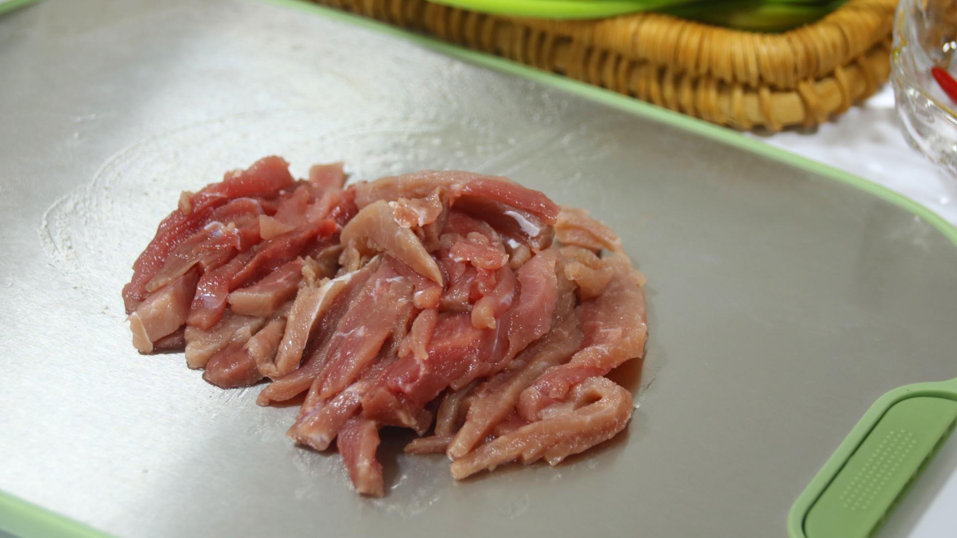 1、我們先來準備今天需要的食材,這塊肉是上週買的,冰箱冷凍過後,看起來沒那麼新鮮了,改刀切一下,切成絲;