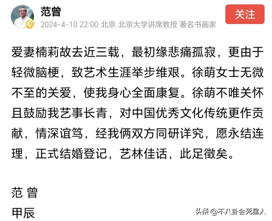 範曾也發文分享了這段婚姻,他的三婚妻子楠莉3年前去世,範曾因爲患過輕微腦梗差點無法繼續創作生涯,幸好有徐夢的照顧才熬過來了,並且能繼續藝術創作。