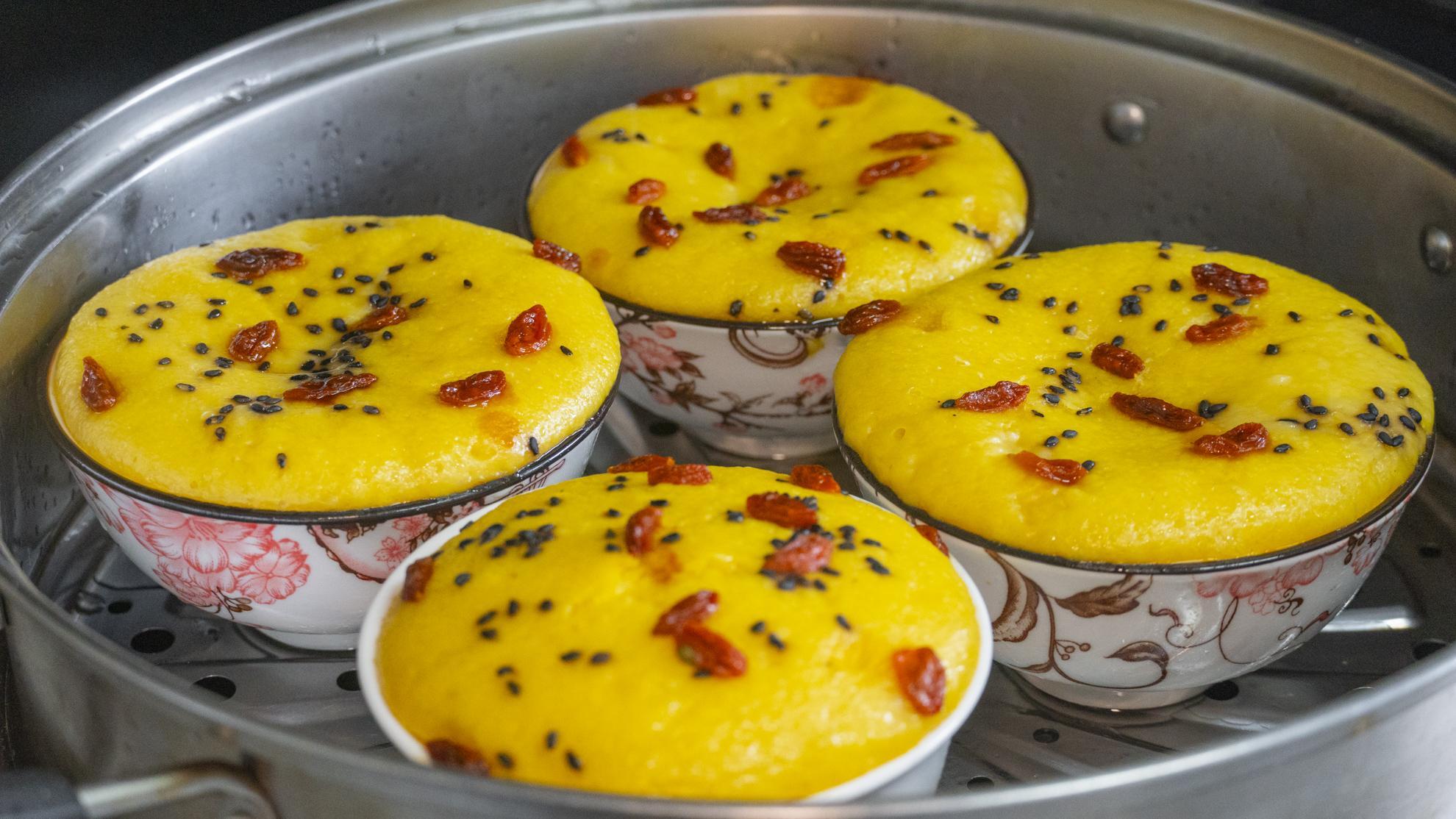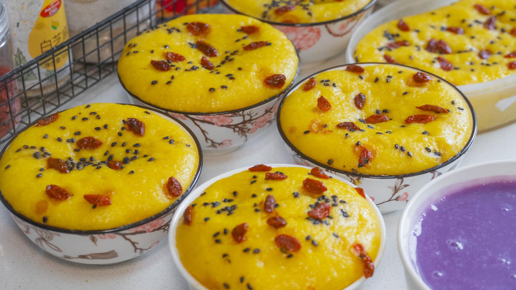 3、發糕蒸好了關火燜3分鐘再出鍋,避免塌陷。