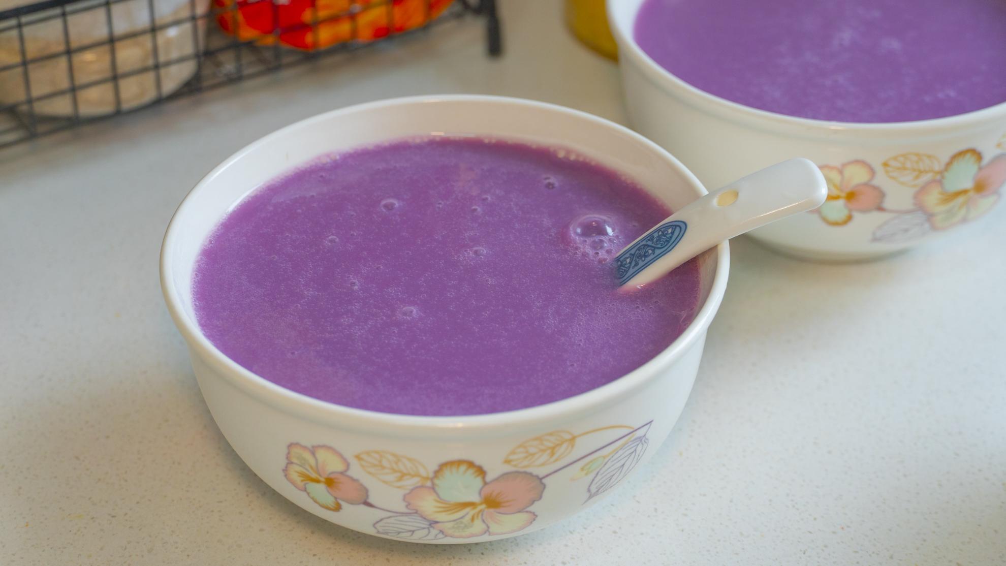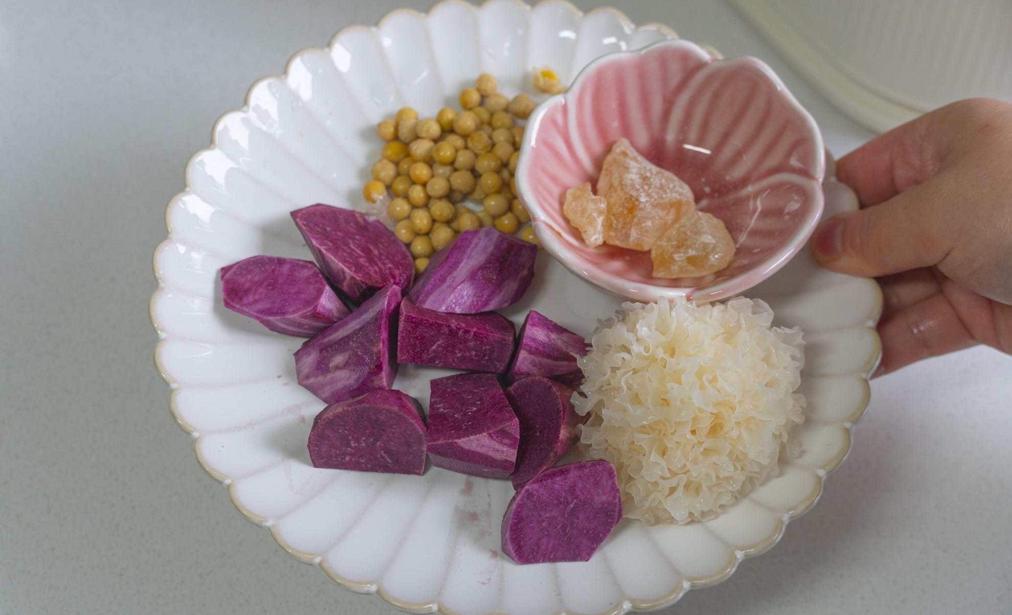 1、蒸發糕的時間我還煮了一點豆漿,用的紫薯、銀耳和 黃豆,還加了幾顆黃冰糖。