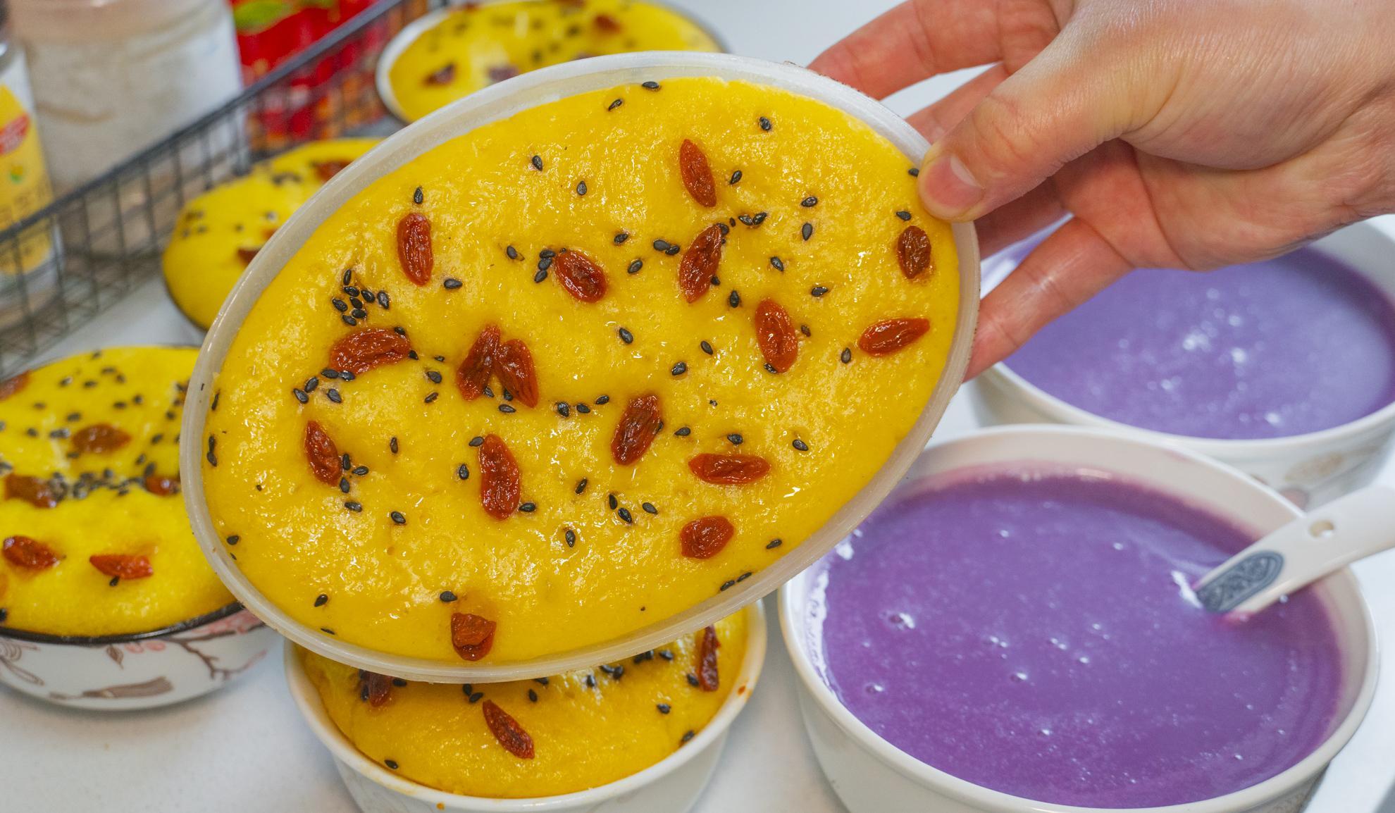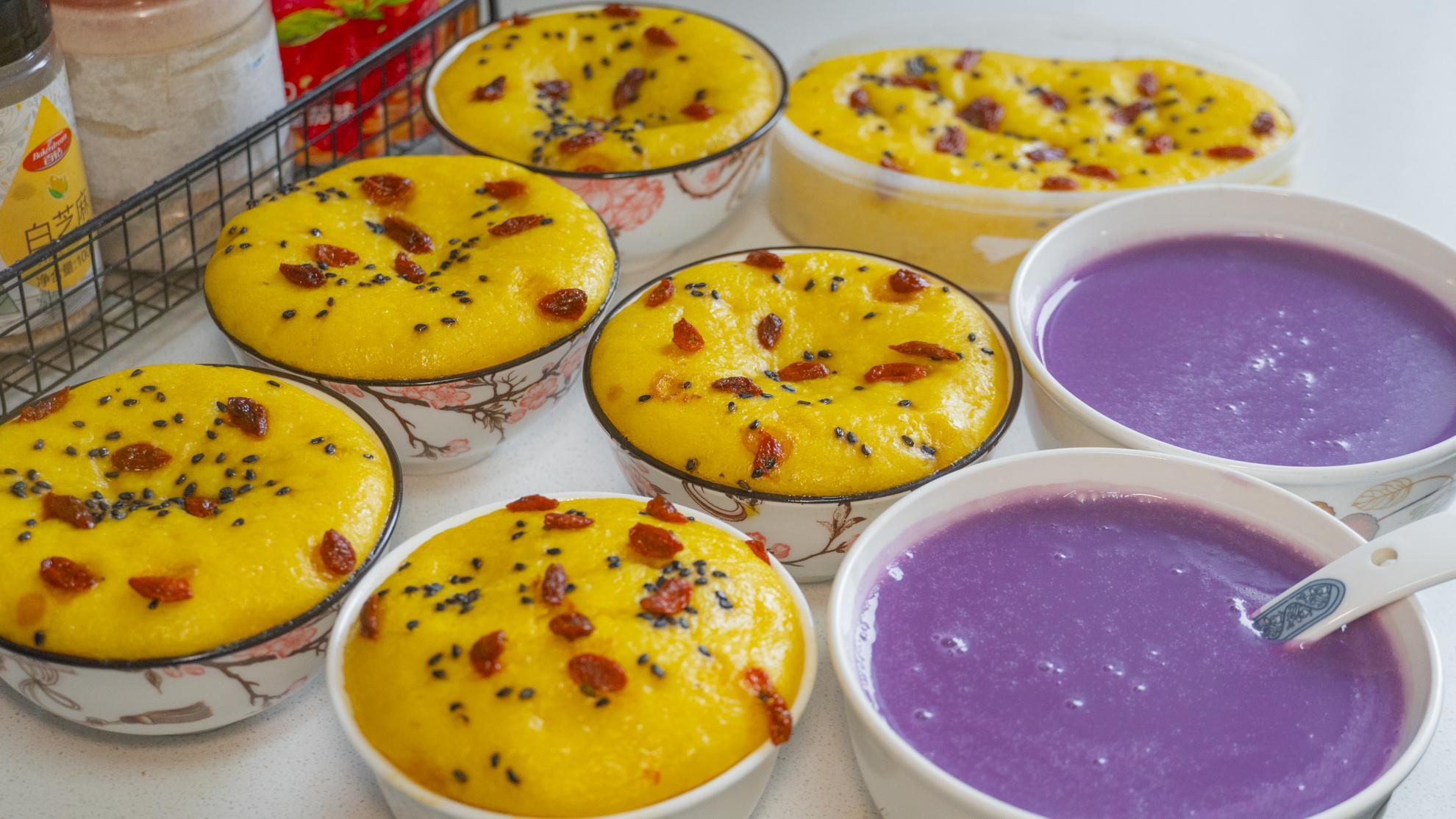食材清單:小米、南瓜、麪粉、木薯粉、酵母、白糖、牛奶、紅棗、葡萄乾、銀耳、紫薯、黃豆