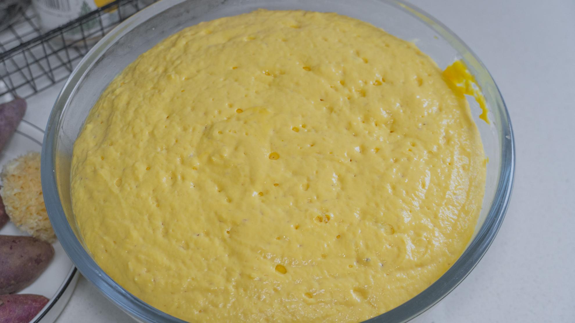 2、南瓜小米糊的話差不多就是600克的樣子,攪拌到沒有面疙瘩就可以了,這個麪糊就是含水量比較足,很稠的。蓋起來,先給它發酵至兩倍大,現在的溫度比較高了,不會超過兩個小時的。