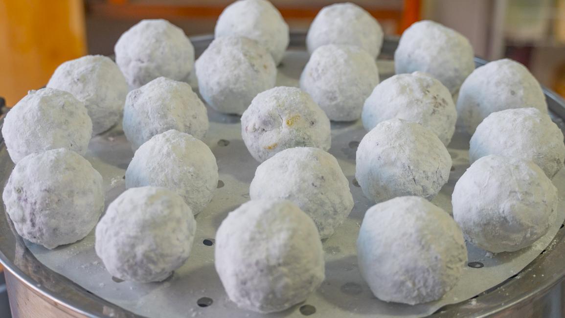 3、再往裏面加200克糯米粉,先拌勻,再捏成大一點的小圓球,捏緊實一些。放清水裏過一下,再滾上一層幹糯米粉,粘豆包生胚就做好了。