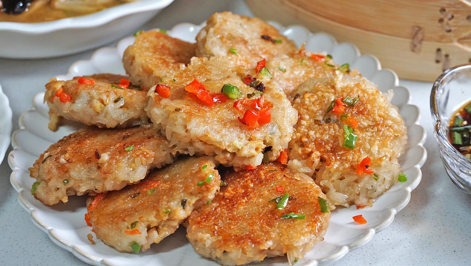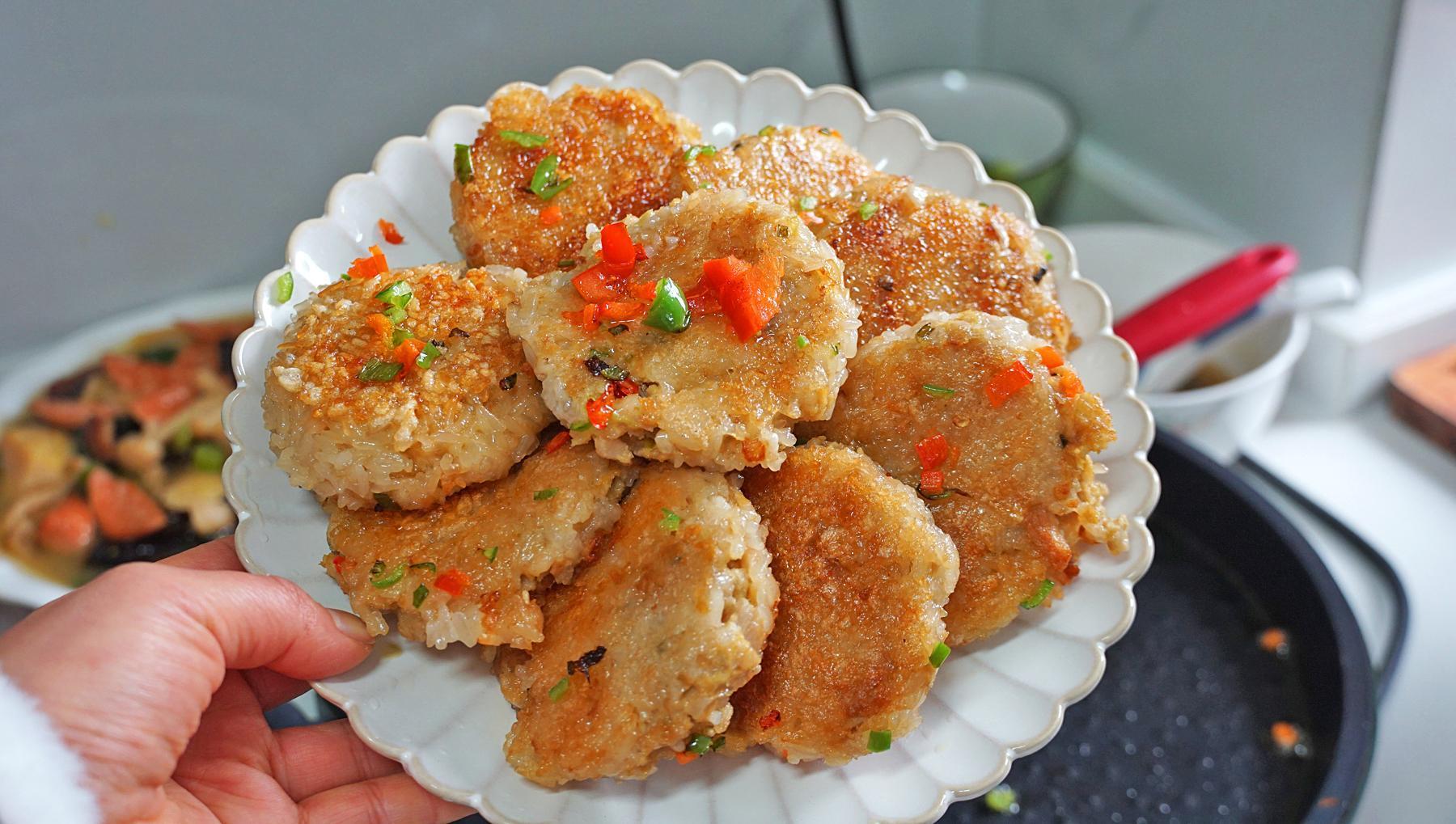 6、糯米餅放到油裏面再拖一下,兩面都煎成這種金黃色焦焦的,撒點青紅辣椒丁點綴一下就給它盛出來,