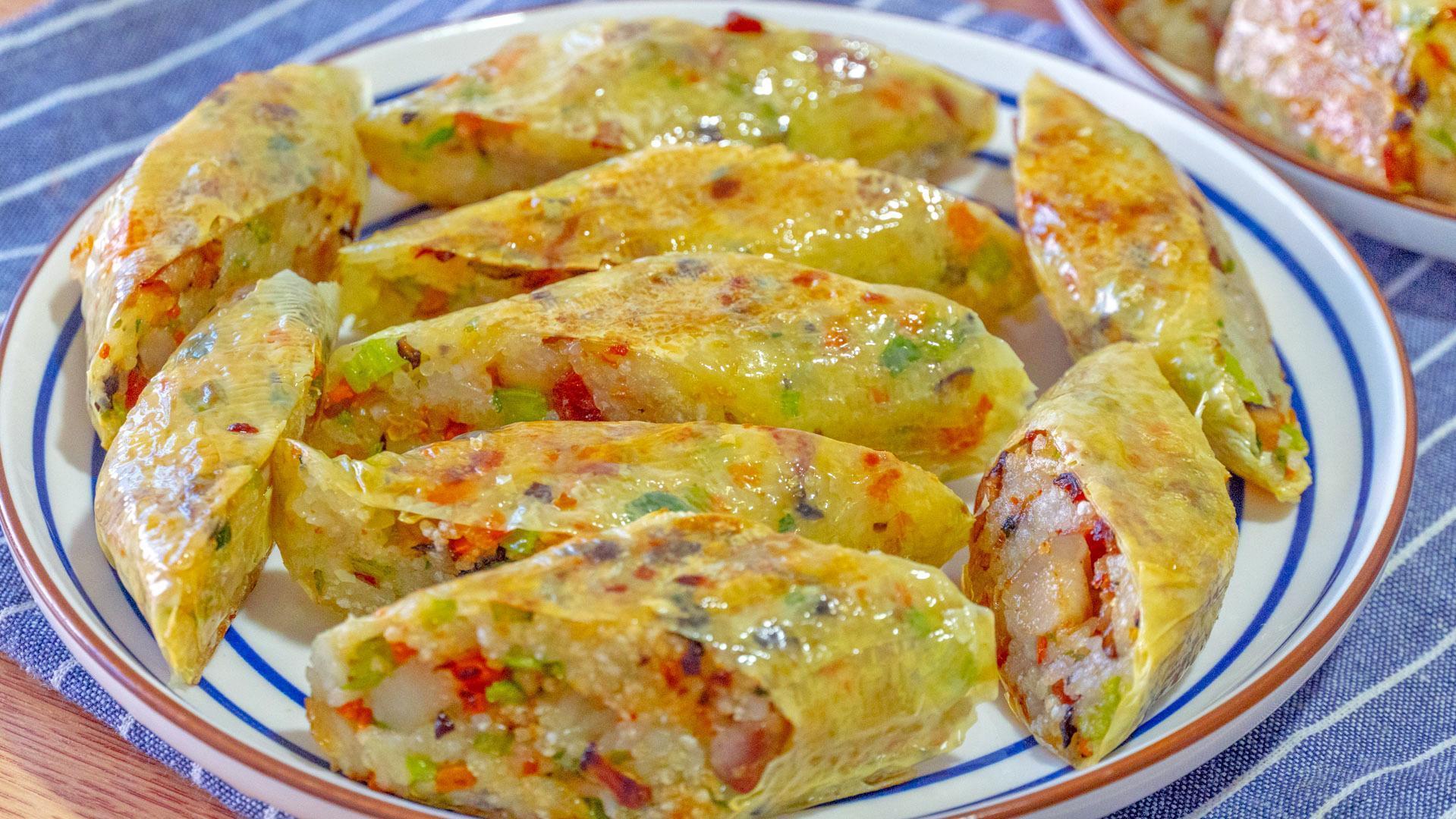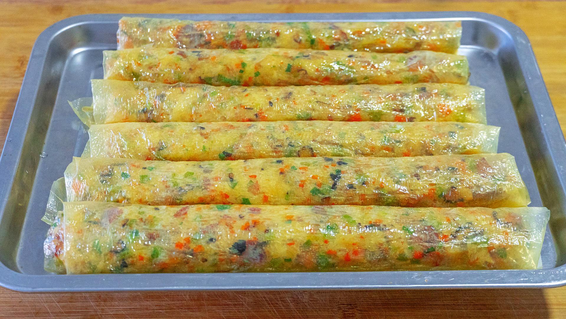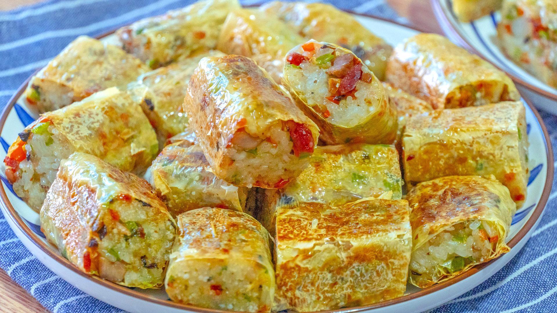 8、喫的時候切成小塊兒,大小自己喜歡就好。最後再用油煎一下, 喫起來會更香。平底鍋倒點油,放入切好的糯米卷,小火把腐皮煎一下。