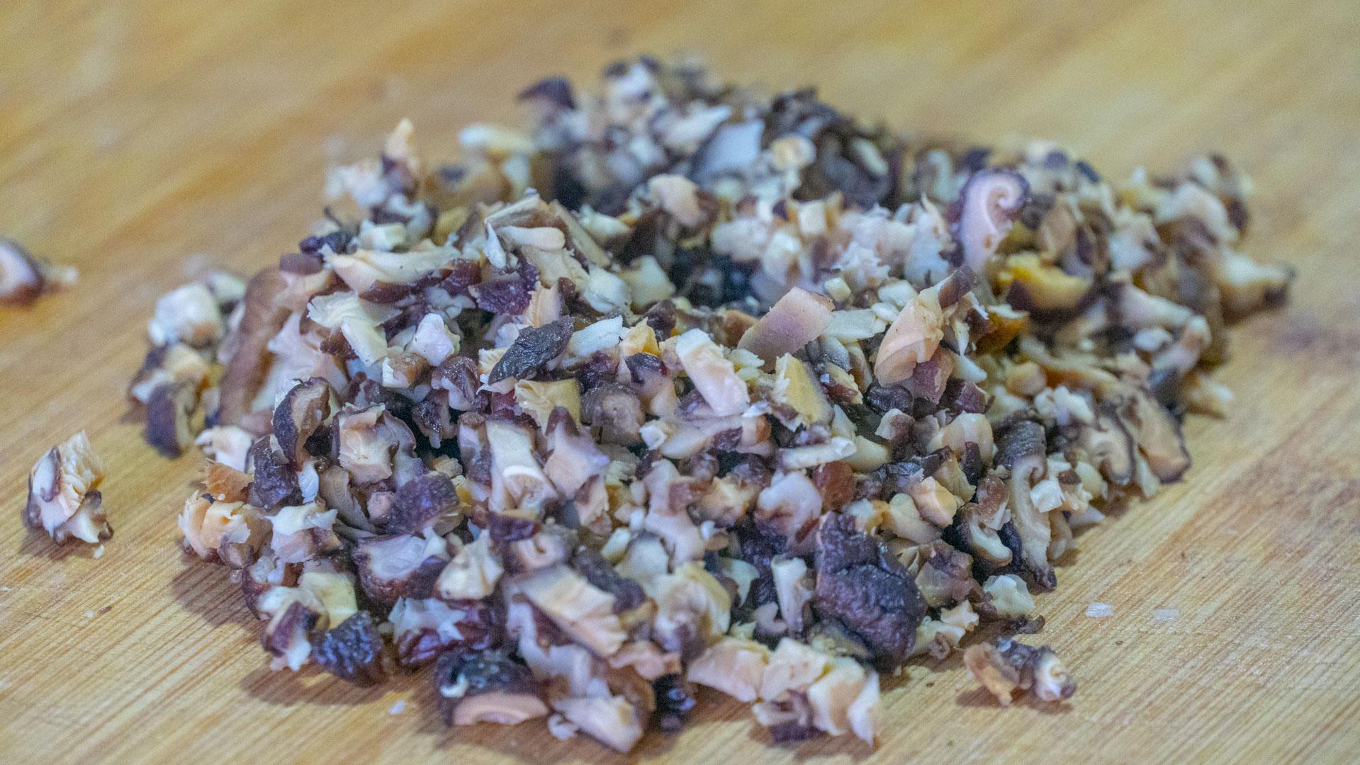 3、再來1個胡蘿蔔,大約是120克切丁,裝起來後也先放一旁。這時候香菇也泡好了,瀝乾水分後也切成小丁;