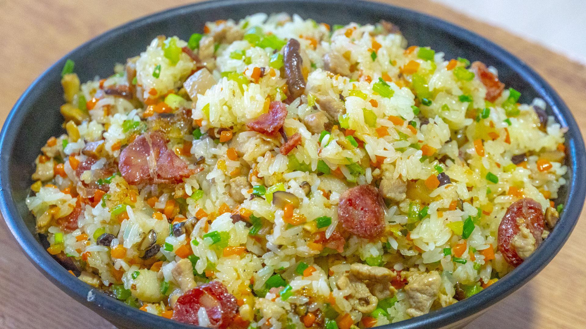 5、接着起鍋熱油,下肉丁倒進來翻炒,變色後把臘腸也倒進來,炒香後下芹菜、胡蘿蔔、香菇一起翻炒2分鐘後簡單調個味。鹽、雞精、胡椒粉、生抽、蠔油,拌勻後把蒸好的糯米飯倒進來,繼續翻炒均勻,出鍋前撒上1把小蔥花,翻拌均勻後就可以盛出來了;