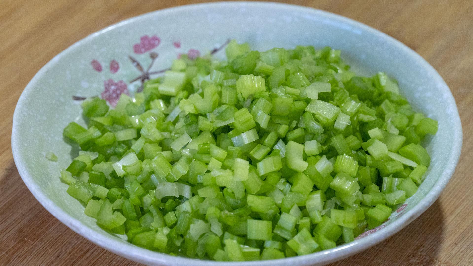 2、豬肉150克,切成小丁後備用,臘腸60克,切片就行,芹菜100克,切成小丁後先放一旁。