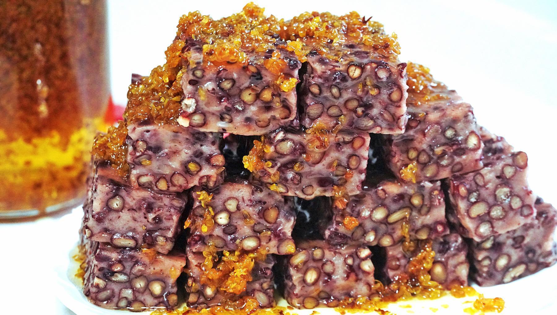 5、怕沒熟透的話就可以籤子插一下,沒有白色的生粉漿就是熟透了,取出來晾一會兒,然後倒出來脫模,切小塊就可以喫了。喜歡喫甜的還可以淋點桂花蜜;
