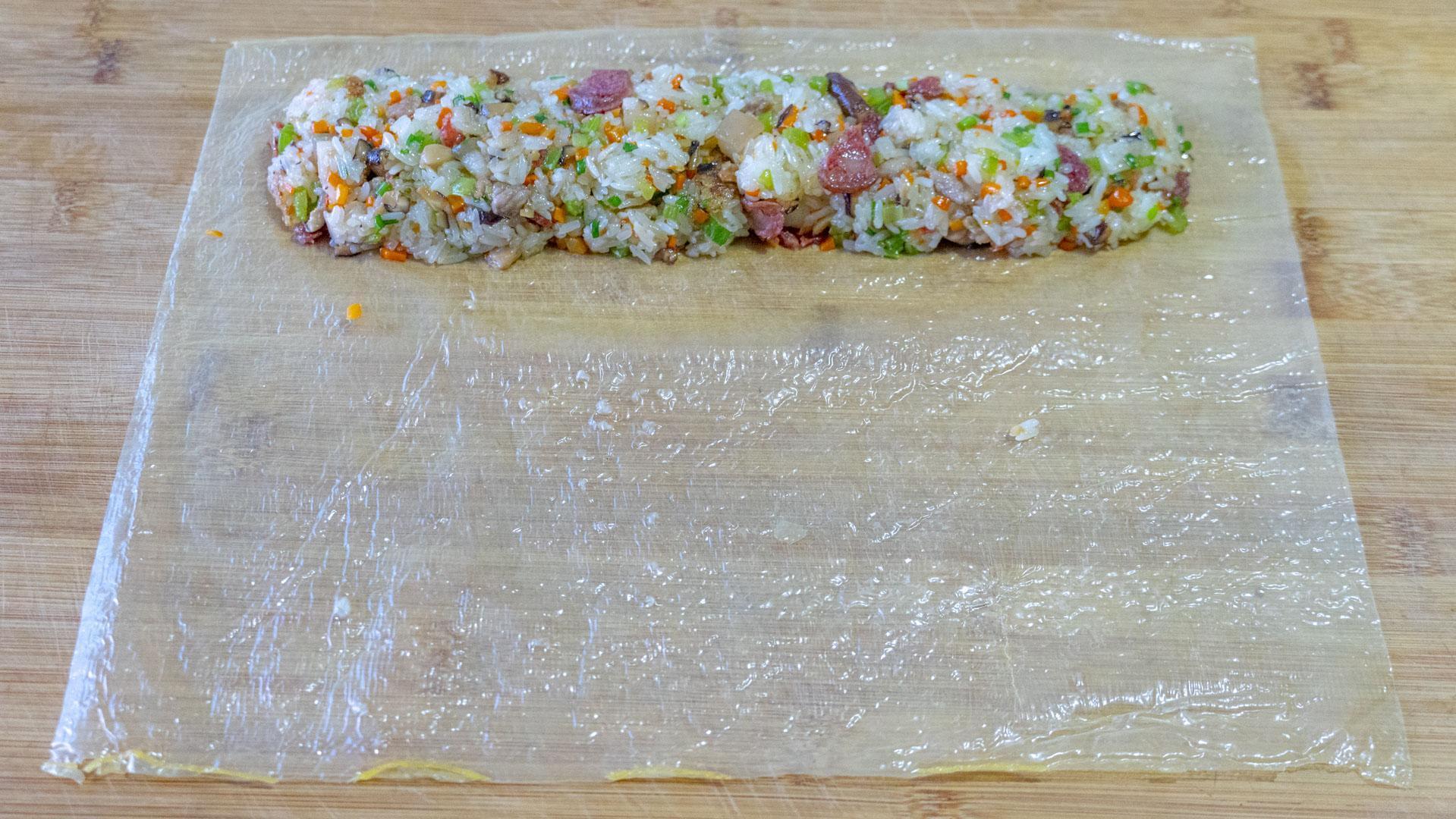 6、接着準備幾張腐皮,先一張張地撕開,動作輕一點,不要撕破了,撕開後的腐皮是非常薄而透明的。然後取一張出來鋪上一條糯米飯,兩邊對着後再捲起來。