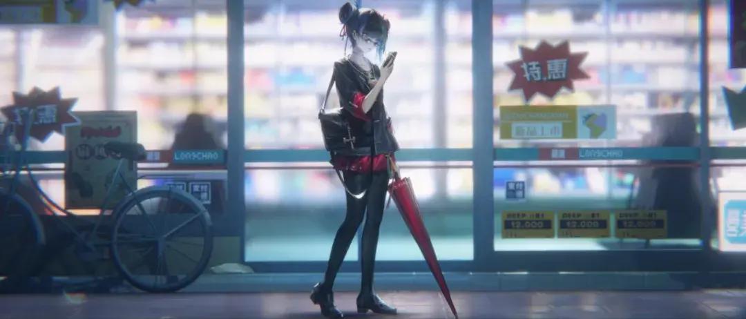 譬如登陸頁面的角色“長命鎖”(也就是開頭提到火鍋劇情的主角),紅紙傘和紅黑配色中式短衫搭配,在便利店門口泛起詭異感十足的紅光,頗有種中式怪談的感覺。