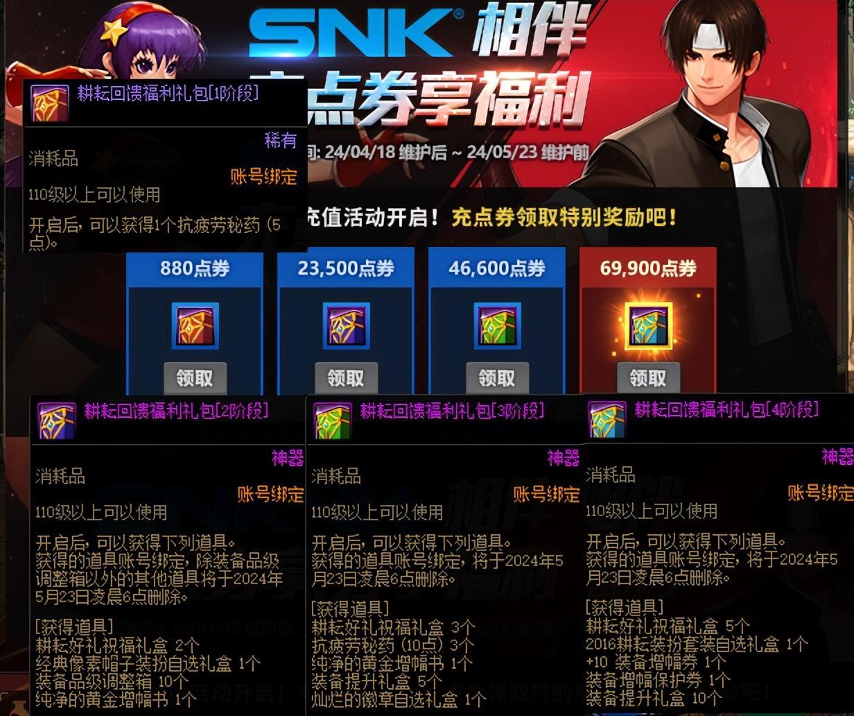 【2】SNK充值活動,累計充值達到880/23500/46600/69900點券時,可解鎖不同檔次的獎勵。