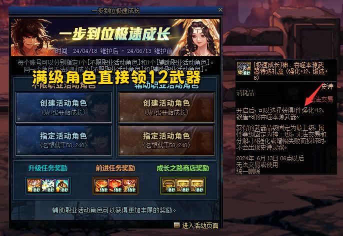 其中一個最重要、也是門檻最低的獎勵是,輸出職業升到滿級可領取一把+12武器,相當於人均送了一把武器。