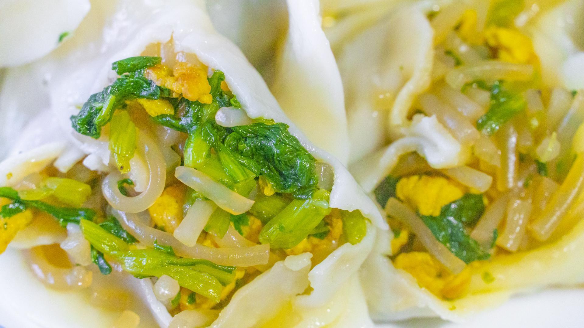 食材:茼蒿、雞蛋、蝦皮、紅薯粉、餃子皮、鹽、雞精、生抽、蠔油、胡椒粉、香油