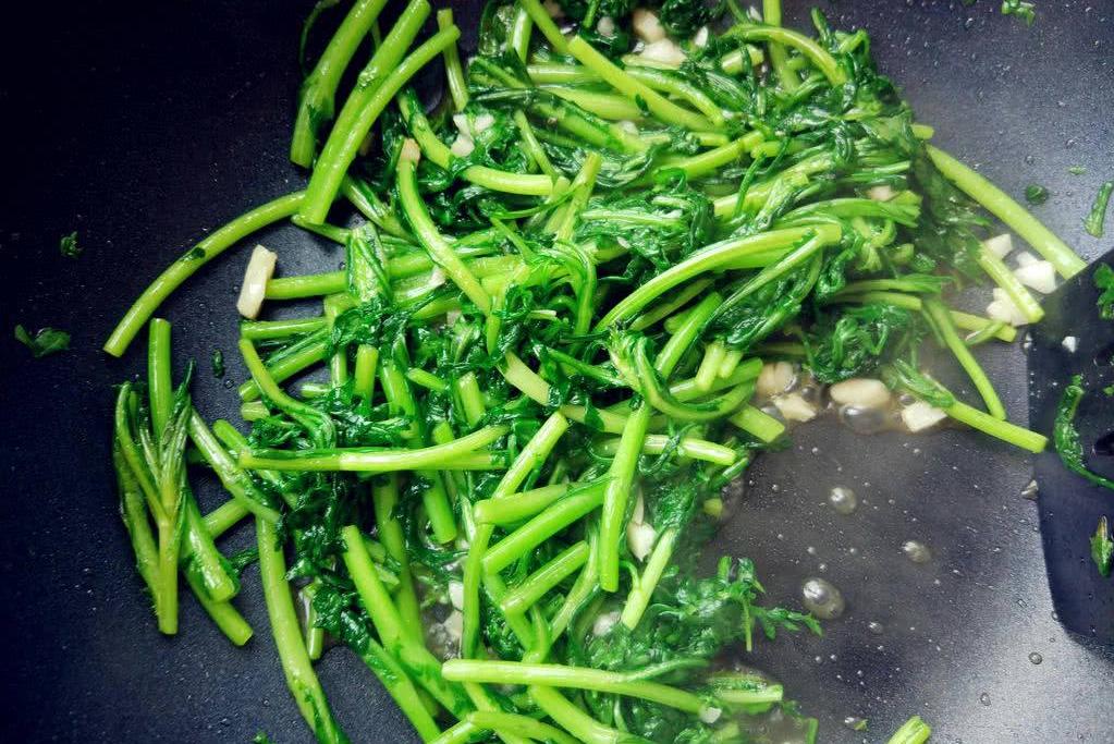 3、起鍋熱油,油熱後放入蒜末,煸炒出香味,先倒入茼蒿莖,翻炒一會,再倒入茼蒿葉子,快速翻炒到變色。