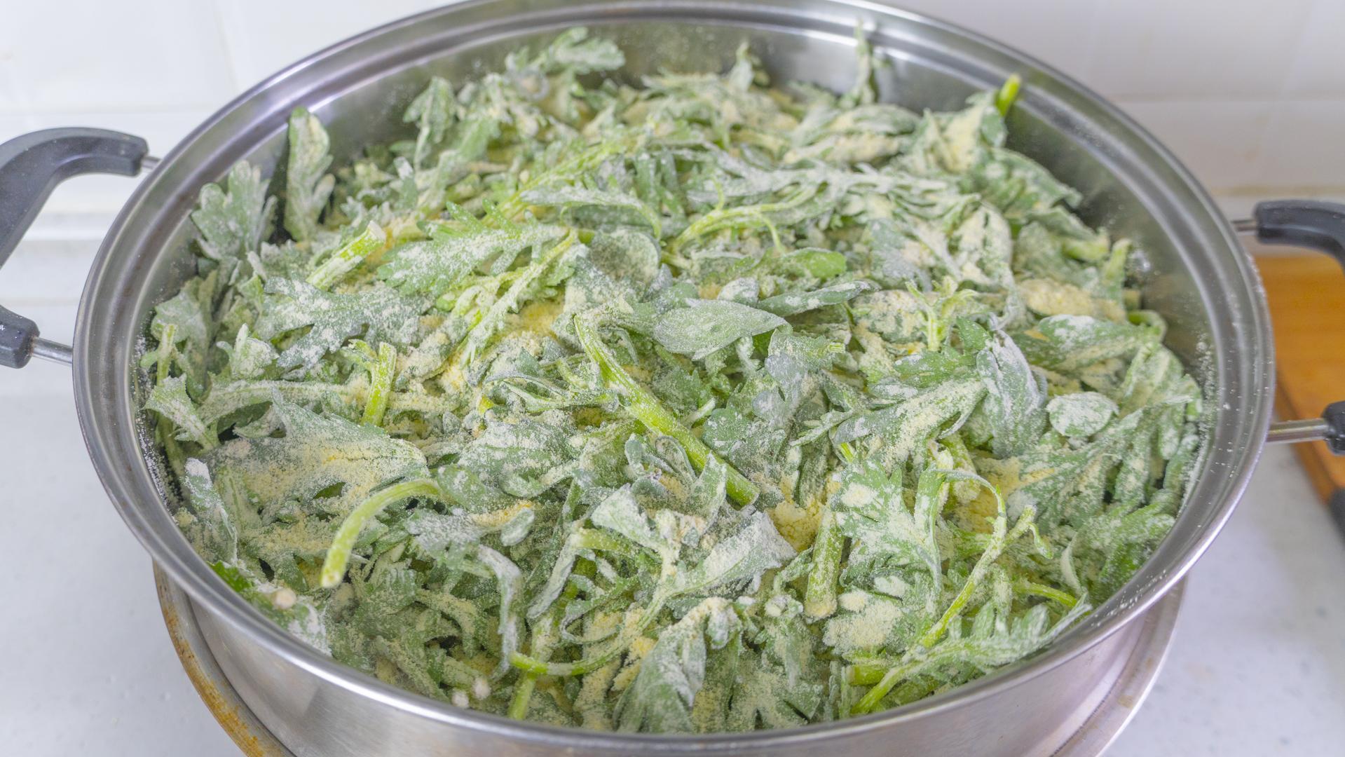 4、接着將拌好的麪粉撒在茼蒿上面,再輕輕的抓拌均勻,讓茼蒿上能掛上一層,起鍋燒水,水開後將茼蒿放進來,放進去的時候要鬆散一些,不要堆的太緊實了,也千萬不要按壓。水開上汽後,大火蒸5分鐘,麪粉蒸熟了就可以了。
