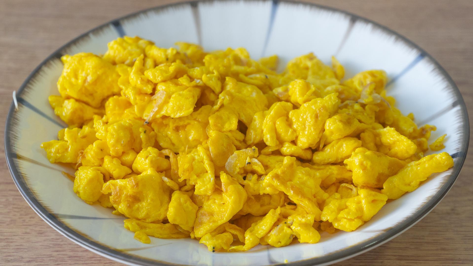 3、接着我們準備5個雞蛋,加一勺鹽後先攪散,起鍋熱油,先加一把蝦皮炒一炒,炒香後倒入蛋液,邊煎邊用筷子攪散。炒成雞蛋碎就可以了,盛出來後先晾涼。