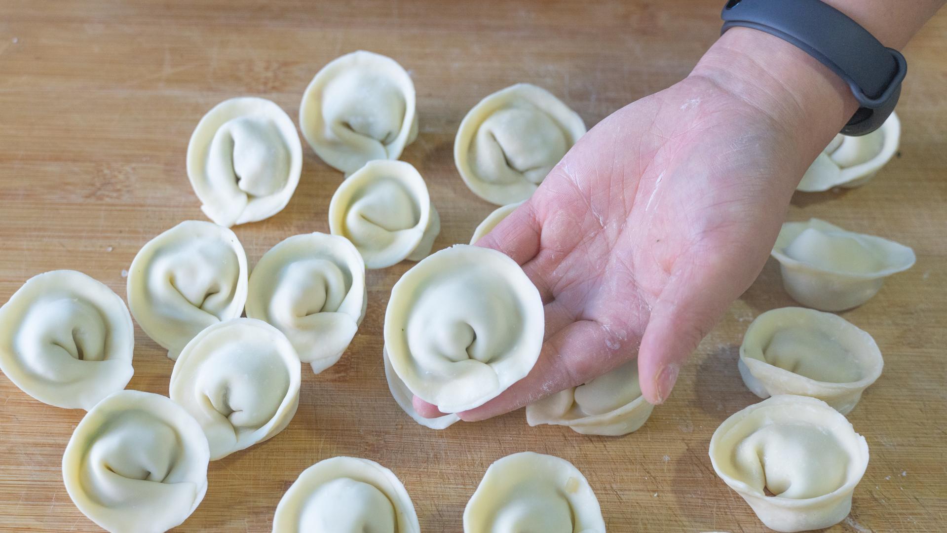 6、接着準備50個餃子皮,圓形方形的都可以,用自己喜歡的手法包起來就可以了。