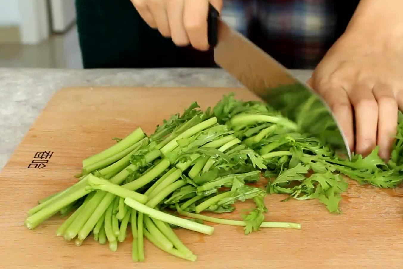 1、茼蒿摘洗乾淨,瀝乾水分後切成段備用;