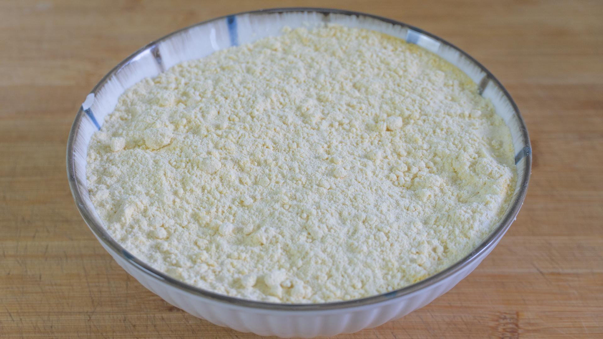 3、另準備一個碗,加一大勺麪粉、一大勺玉米麪粉,一勺鹽,攪拌均勻後就可以了。