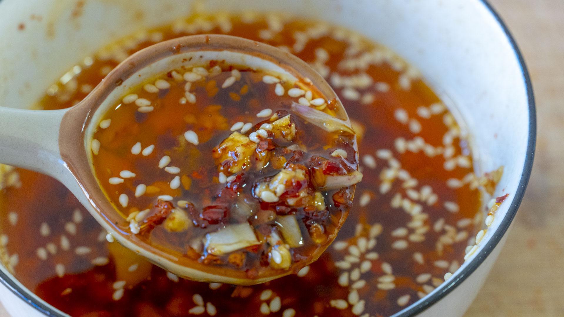 5、接着準備一個醬汁:生抽、香醋、蠔油、鹽、糖、雞精、蒜末、辣椒麪、白芝麻、熱油 ,拌勻後香味兒立馬就出來了。