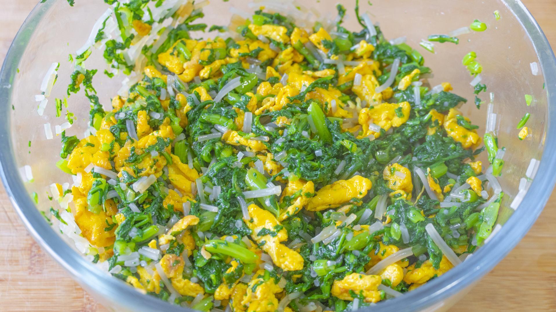 5、再把雞蛋也倒進來,拌勻後就可以調味兒,鹽、雞精、生抽、蠔油、胡椒粉、香油,拌勻後就可以了,香噴噴的茼蒿雞蛋餡兒就調好了。