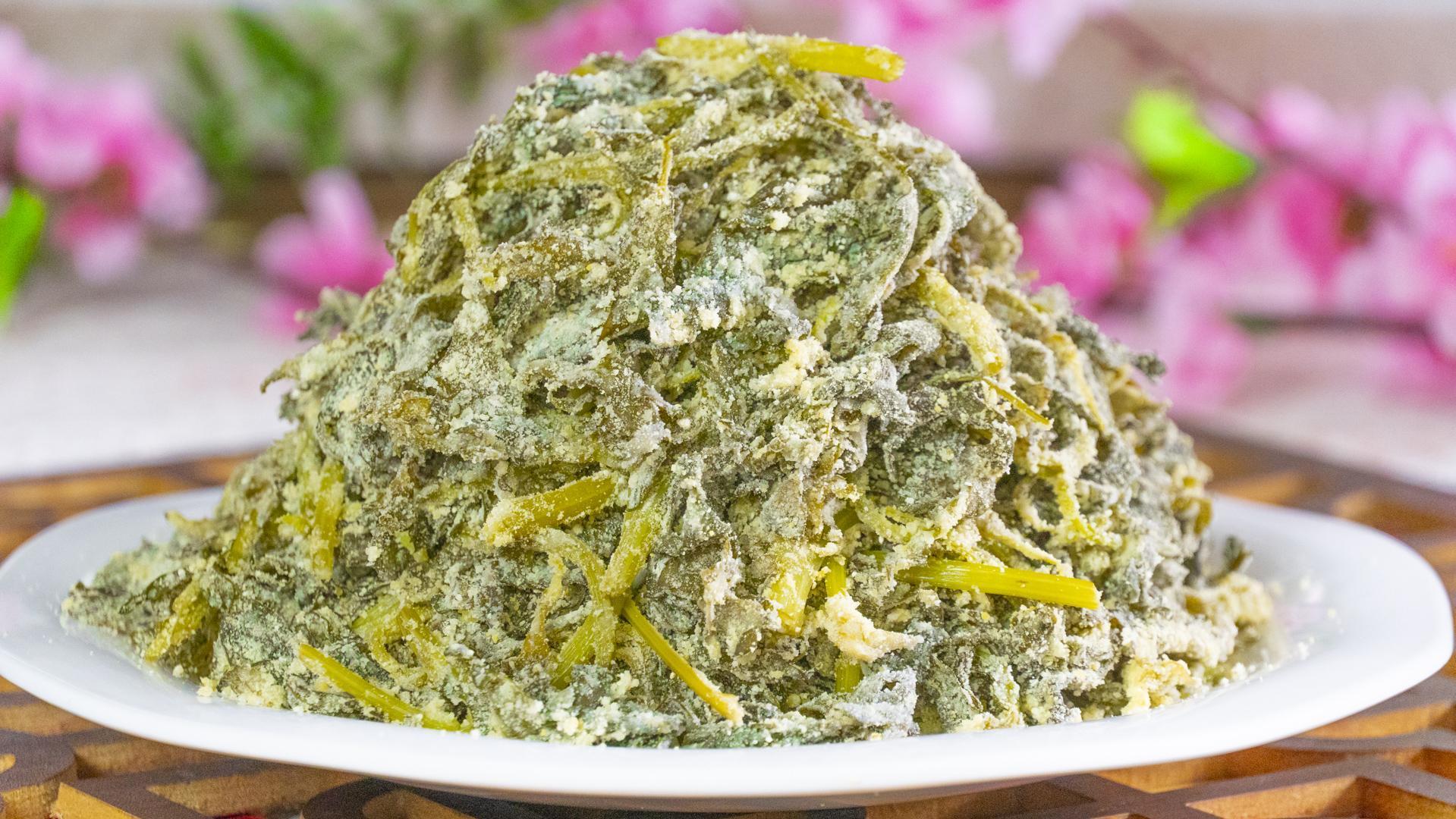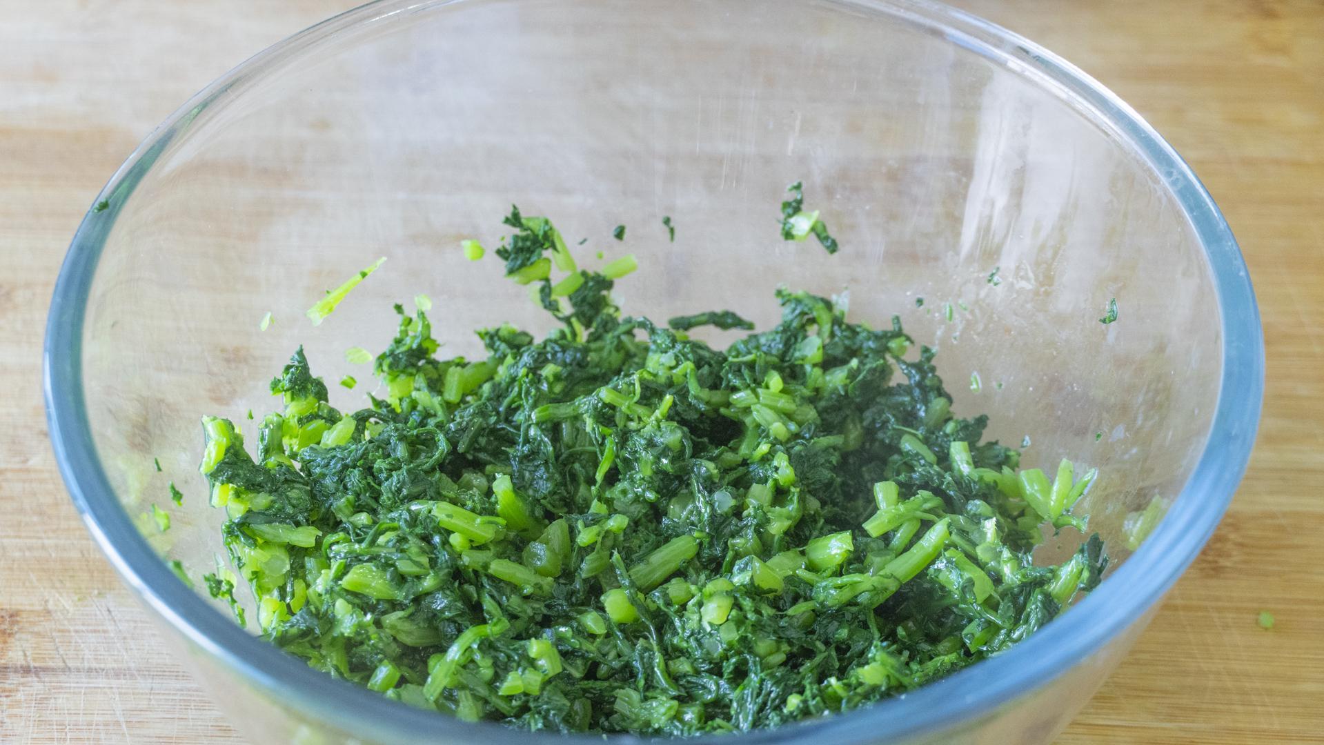 食材:茼蒿、玉米麪、麪粉、大蒜、蔥花、雞蛋、生抽、香醋、香油、鹽、糖