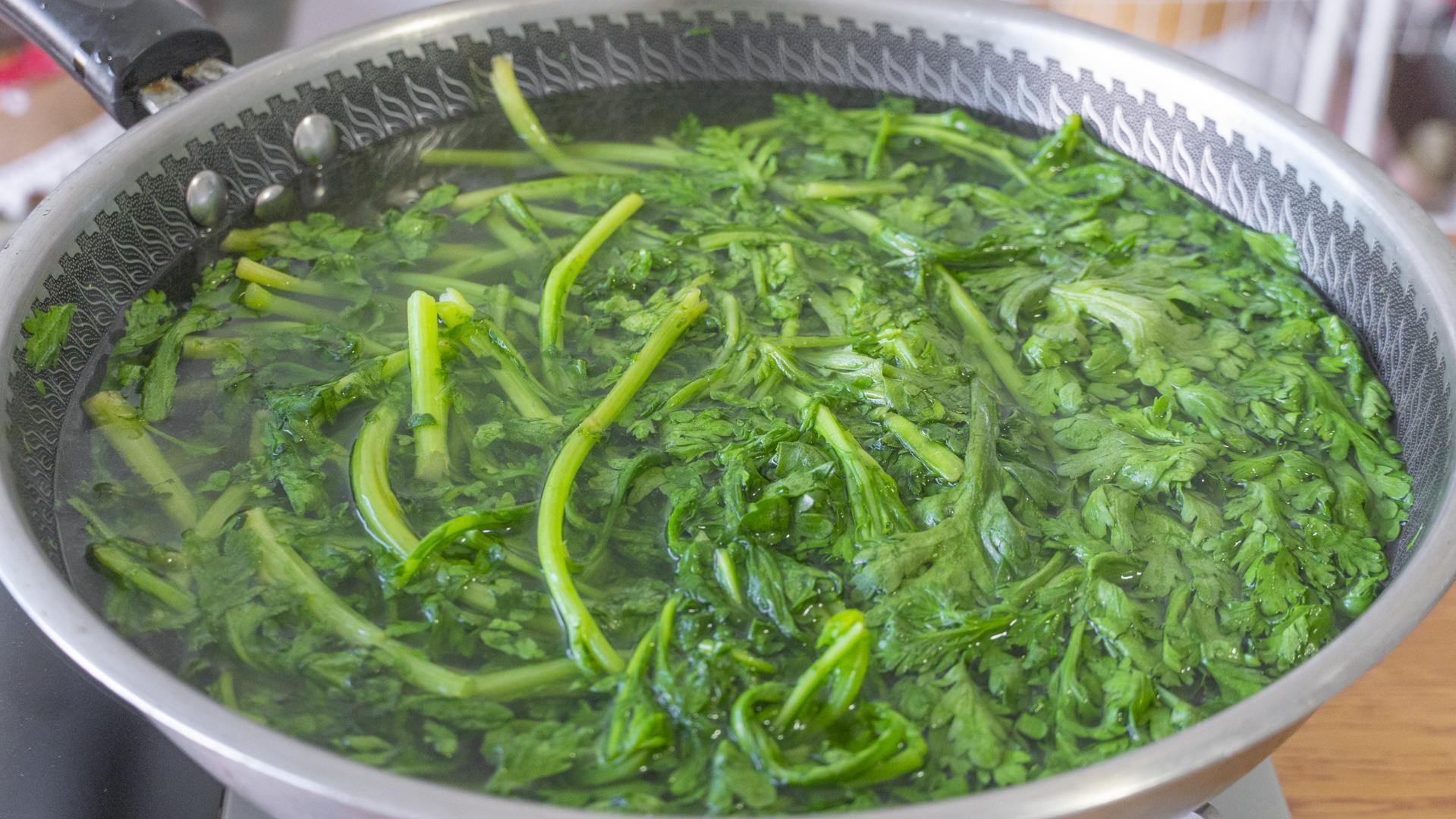 3、起鍋燒水,加一勺鹽和兩滴油,鍋裏水開後先下梗子燙1分鐘,,再下葉子焯水30秒。