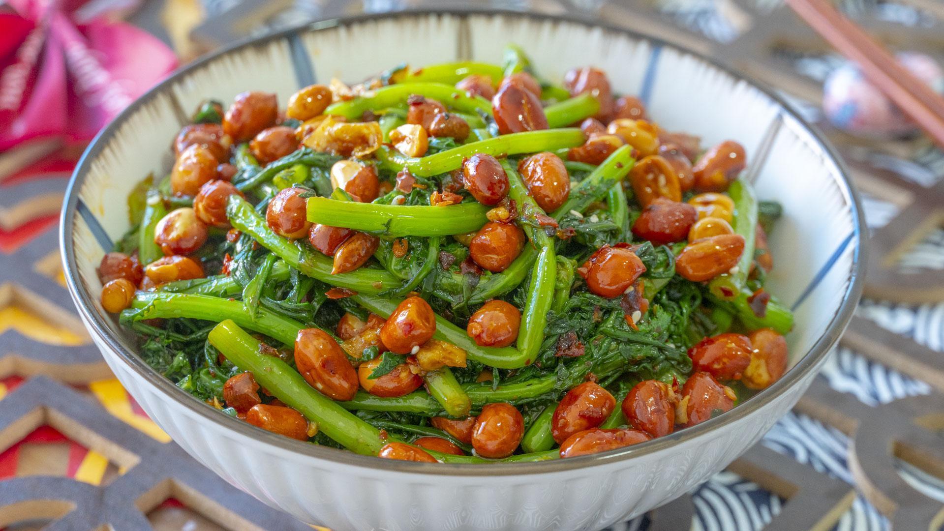 6、接着我們把花生米和茼蒿倒一起,再淋上調好的醬汁,拌勻後就可以開喫了,花生米的酥香搭配茼蒿的鮮嫩,喫起來清爽不油膩。