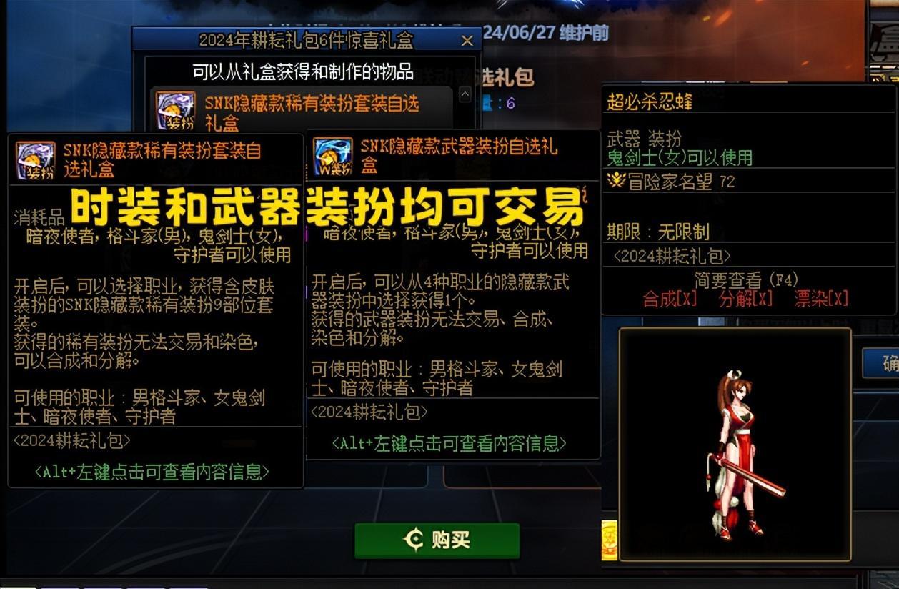 今年耕耘禮包中至尊時裝有一套“不知火舞”,可以給到3個職業穿戴,分別是女鬼劍、守護者、以及暗夜使者。