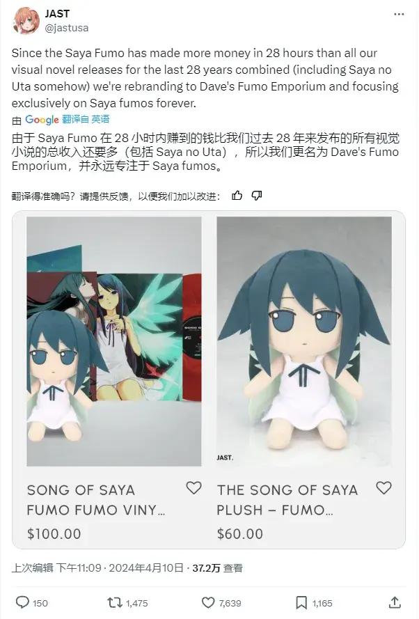 “由於沙耶Fumo在28小時內賺到的錢,比我們過去28年裏發佈的所有視覺小說(包括《沙耶之歌》)的總收入還要多,所以我們決定改名,改成‘戴夫的Fumo商店’,並永遠專注於賣沙耶Fumo。”