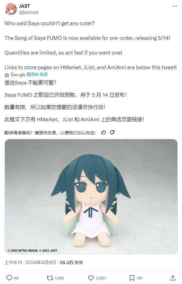 很難說沙耶Fumo的爆火究竟是不是在JAST的預期之內。打預購一開始,戴夫及JAST官推就在圍繞沙耶Fumo展開玩梗式營銷,跟粉絲積極互動,轉發網上的沙耶二創和Cos。