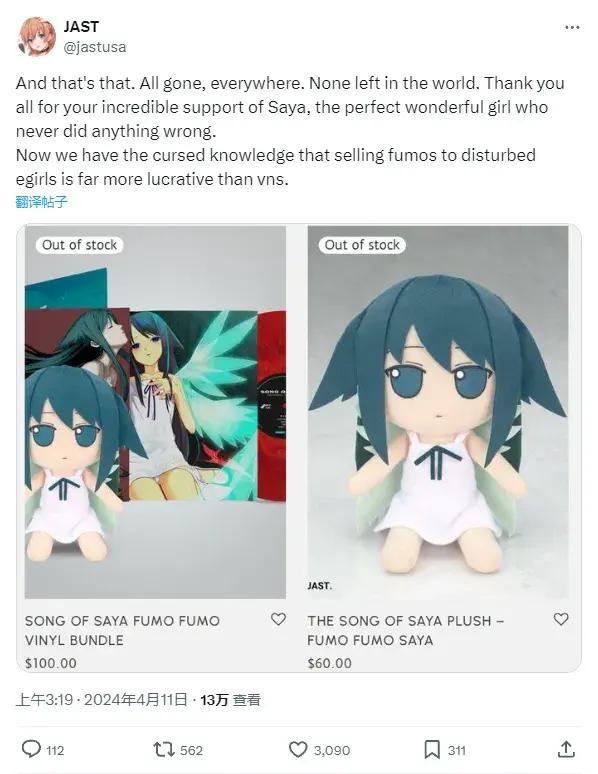 但在預購開放後的第二天,也就是4月10日,單賣的沙耶Fumo就被搶購一空;又過了一天,捆綁包也賣沒了。