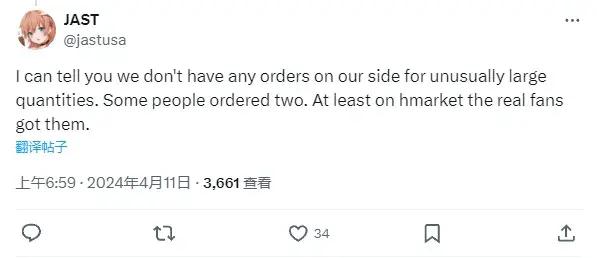 戴夫聲稱,他們那邊沒有接收到任何異常的大批量訂單,最多有人買了兩隻。所以他認爲,至少在HMarket上,“是真正的粉絲買到了它們”,而非倒賣Fumo的黃牛。