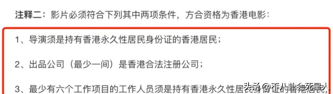 因爲金像獎在評選上就有規定,入圍的電影必須符合三個條件中至少兩個以上,一是導演須有香港居住證,二出品公司至少一間是香港的,三至少6位項目工作人員是香港居民。
